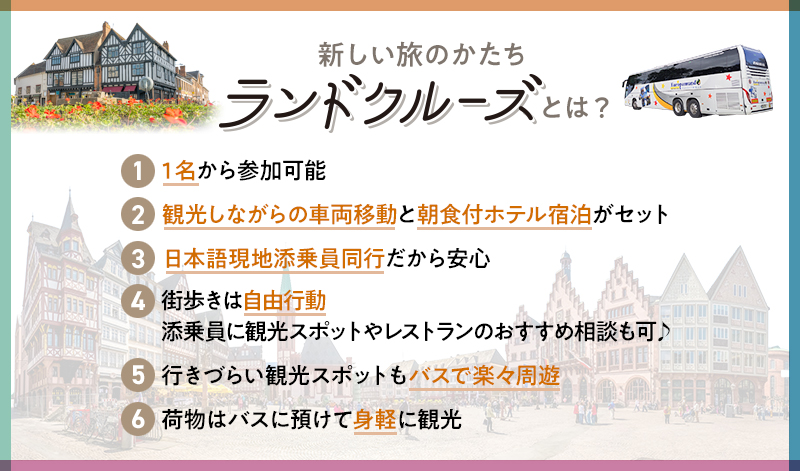 せっかくのヨーロッパ旅行、いろいろな場所を巡りたいけれど、移動を考えると行けるところが限定されてしまう…。そんな悩みを解決してくれるのが、周遊バスで旅する「ランドクルーズ」という新しい旅スタイル! 今回は大注目のランドクルーズをご紹介します♪