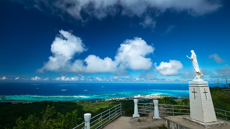 360度ぐるっと島を一望できる「タポチョ山」。天気の良い日には、山頂の展望台からマニャガハ島やテニアン島までを見渡すことができるので、景色を楽しみたい人におすすめです。タポチョ山にあるマリア像は、島の人たちが祈りを捧げに訪れる神聖な場所。山頂(標高約475m)まで個人で行く場合は、砂利道や舗装されていない道を通るので、四駆自動車のレンタルがおすすめ。ツアーに参加するなら、バギーでヒルクライムを楽しむオプショナルツアーも人気です。
