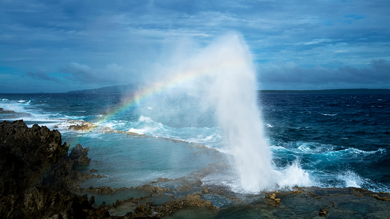 テニアン島北東部の海岸沿いにある「ブローホール」。日本語名で「潮吹き海岸」とも呼ばれるこのスポットでは、浸食された岩場の穴から、海水の柱が勢いよく吹き出す様子を間近で見ることができます。天候や海の状況によって水しぶきの高さは変わるものの、強い波が来たときには10m以上の水柱が吹き上がることも!潮吹き穴の近くでその迫力を感じたい場合は、濡れてもいい格好と歩きやすい靴で行くことをおすすめします。