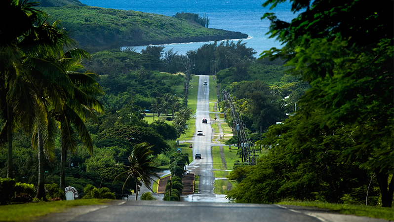 テニアン島を南北に一直線に貫くメインロード、「ブロードウェイ」。島の形がニューヨークのマンハッタン島に似ていることが名前の由来と言われています。約11km真っ直ぐに伸びるこの道を使えば、ロングビーチや日の出神社など、空港からほとんどの観光名所に最短で向かうことができます。ゆったりと上下を繰り返す大らかなスケールは、まさにアメリカそのもの。レンタカーでのんびりとドライブを楽しむのも、テニアン島のエンターテイメントのひとつです。
