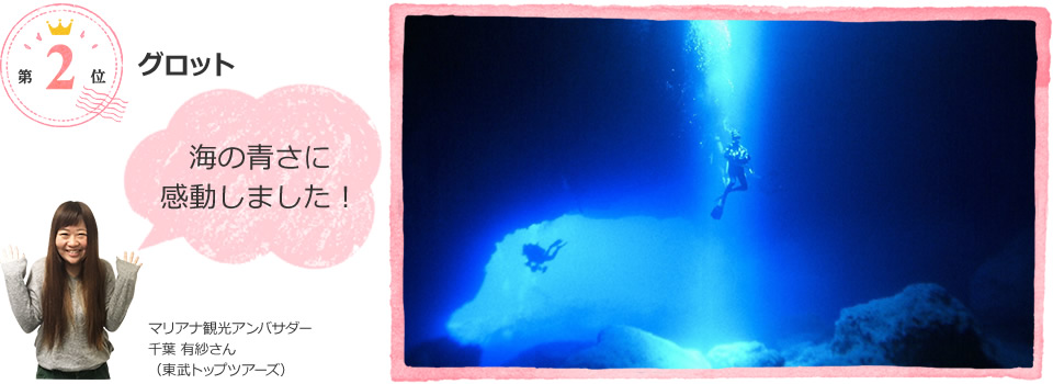 サイパン版・青の洞窟と言われる「グロット」。サイパン北部、マドック岬の先端にある海中洞窟で、世界中のダイバーが憧れる超人気スポットです!グロットの魅力は、なんといっても「グロットブルー」と呼ばれる水の青さ。天気が良い日には太陽の光が海中に差し込み、幻想的な青い光のカーテンが現われることも。洞窟内には外洋に繋がる横穴が3つあり、その穴を抜けるとウミガメや魚たちが住む世界が広がっています。グロットでのダイビングは経験者のみなので、初心者は洞窟の手前でシュノーケリングを楽しんで。