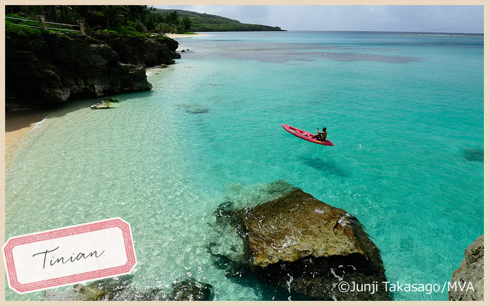サイパンから飛行機でわずか10分の距離にあるテニアン島。「タガ・ビーチ」は日本のCM撮影でも使われたことのある、テニアン島を代表するビーチです。エメラルドグリーンの海が美しく、その透明度の高さはボートが宙に浮いて見えるほど。休日になるとローカルの子供たちが岩場から飛び込んで遊んでいる姿を目にします。夕暮れ時には海も空も一面オレンジ色に染まり、昼間とはまったく違う表情に。ビーチの左側には珊瑚礁があるので、シュノーケリングでカラフルな熱帯魚の世界を覗くこともできます。