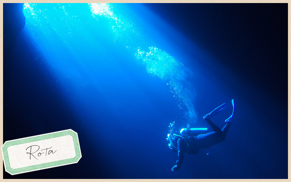 サイパンから小型機で約30分ほどの距離にあるロタには、“ロタブルー”と呼ばれる海の色があります。その美しく神秘的な青を楽しめるのが、サイパンのグロットと並ぶ世界屈指の海中洞窟「ロタホール」。世界中のダイバー憧れの聖地として有名なスポットです。ハノルン岬にぽっかりと空いた横穴を進めば、ドームの天井から差し込む太陽の光が幾重にも重なり、美しい光のカーテンを作り出します。この幻想的な世界に魅了され、何度も訪れるダイバーも少なくありません。ロタホールのベストシーズンは、陽光がホールに真っ直ぐ差し込む4月~9月。