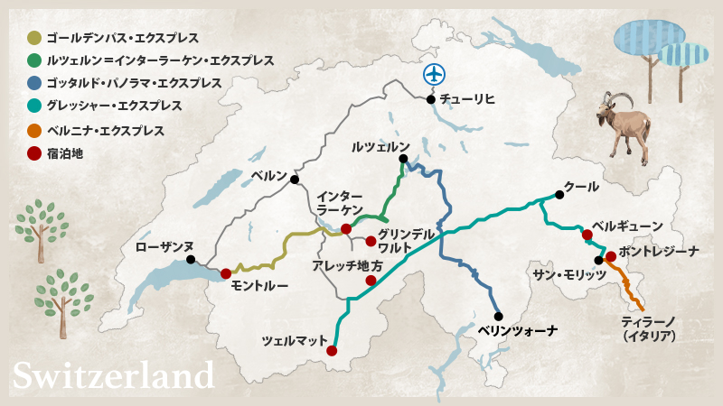 絶景を眺めながら手ぶらで移動する旅が可能なのは、駅から駅、ホテルからホテルへ荷物を託送できるスイスの鉄道の便利なサービスがあるおかげ。大きなスーツケースは先の宿泊地に送っておき、リュックサックなどに1〜2日分の荷物を入れて、軽い荷物で移動すれば、途中下車して小旅行などより自由な旅に♪